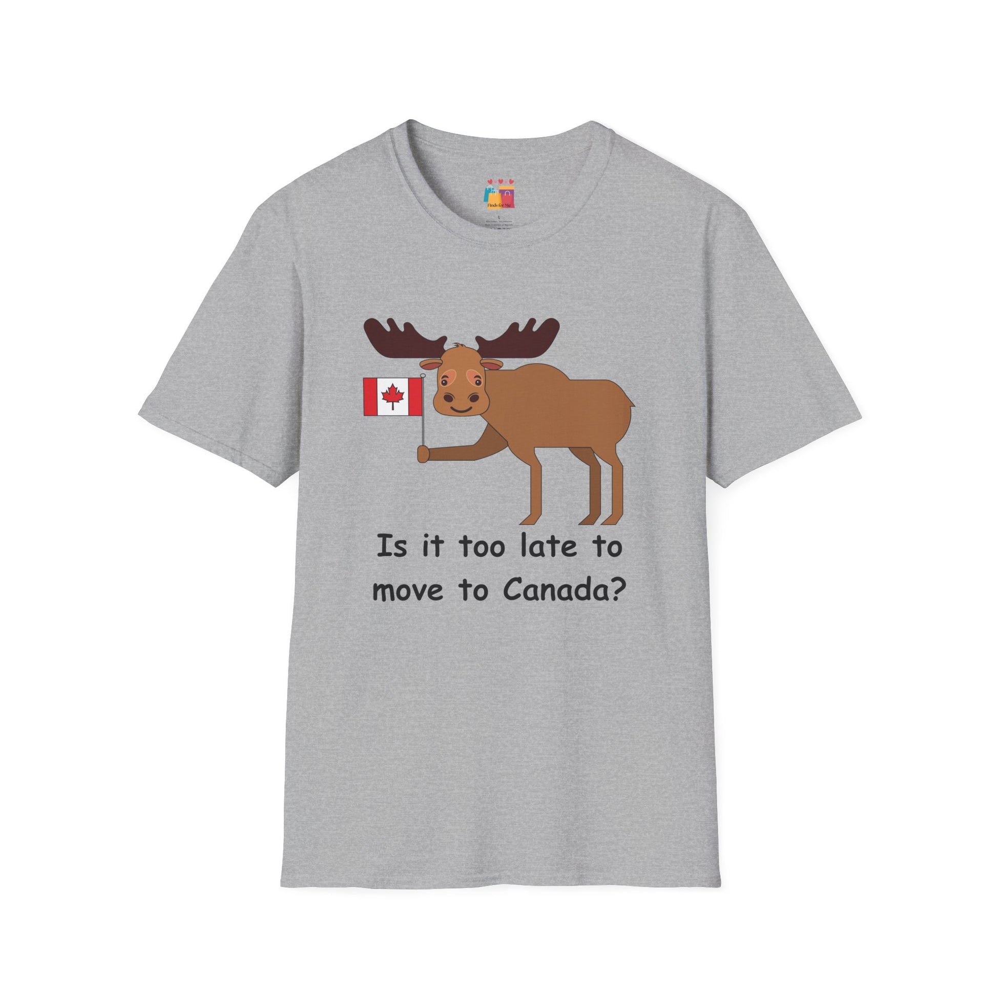 Funny Moose T-Shirt - "Is it too late to move to Canada?" - Unisex Softstyle Tee