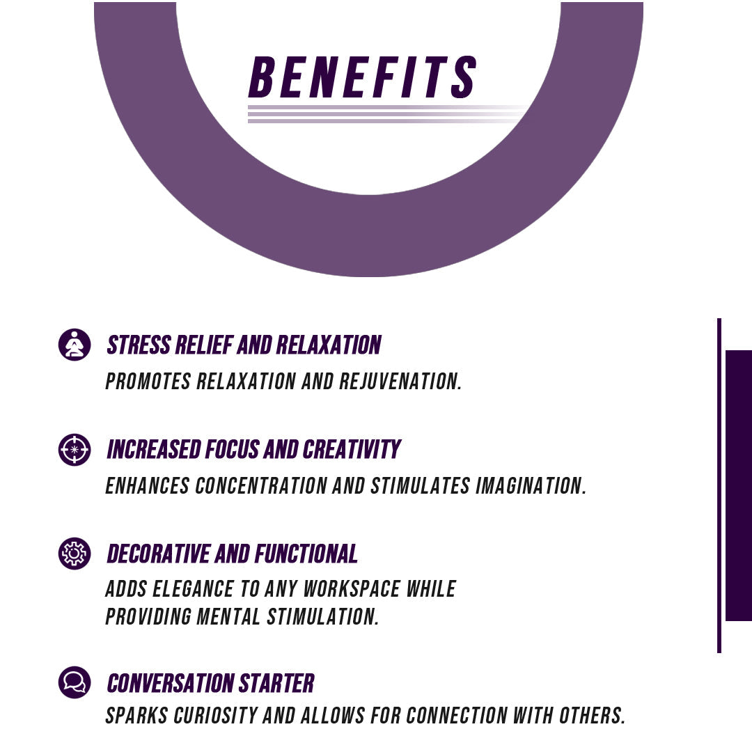 An excellent addition to any desk or workspace. It's a beautifully unique and captivating toy that can help you stay focused and sharp, reduce stress, and promote creativity. Perfect for anyone who needs to take a break from their busy schedule and unwind for a few minutes.