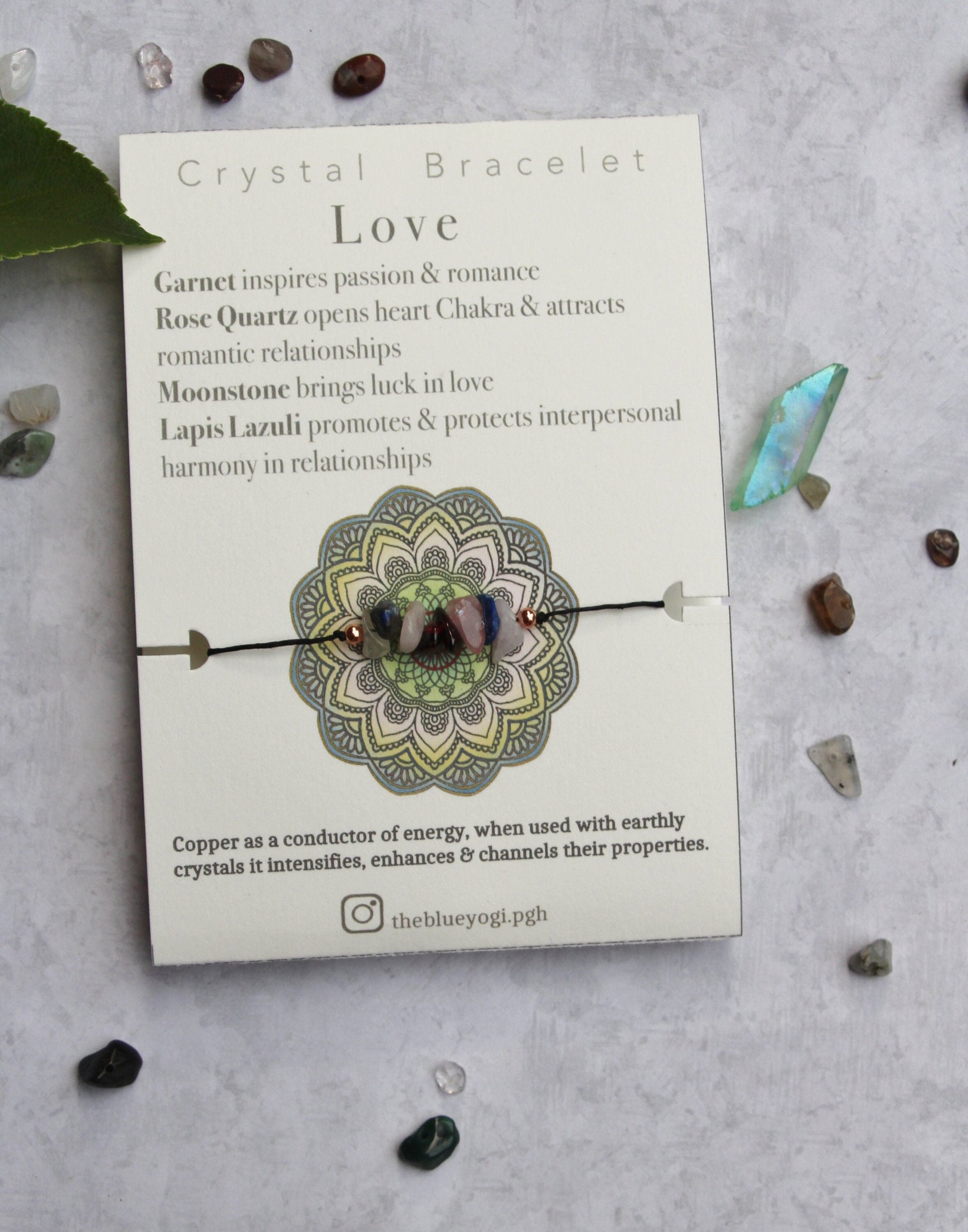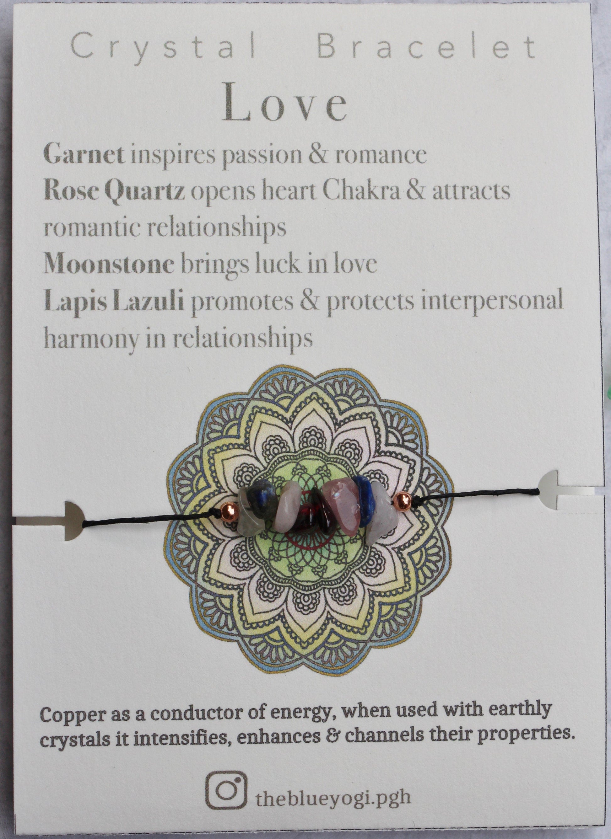 Each Bracelet comes with a card with a Mandala art and healing properties of the crystal (as shown in photo)