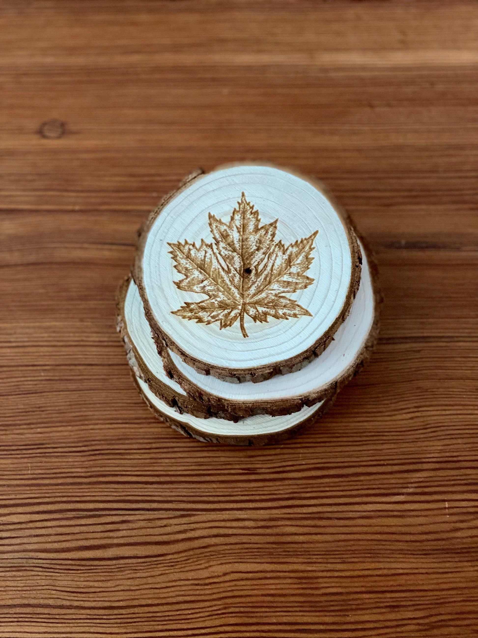 Every coaster features a maple leaf illustration engraved on one side. Coasters are between 3 1/2” and 4” in diameter and are 3/8” thick