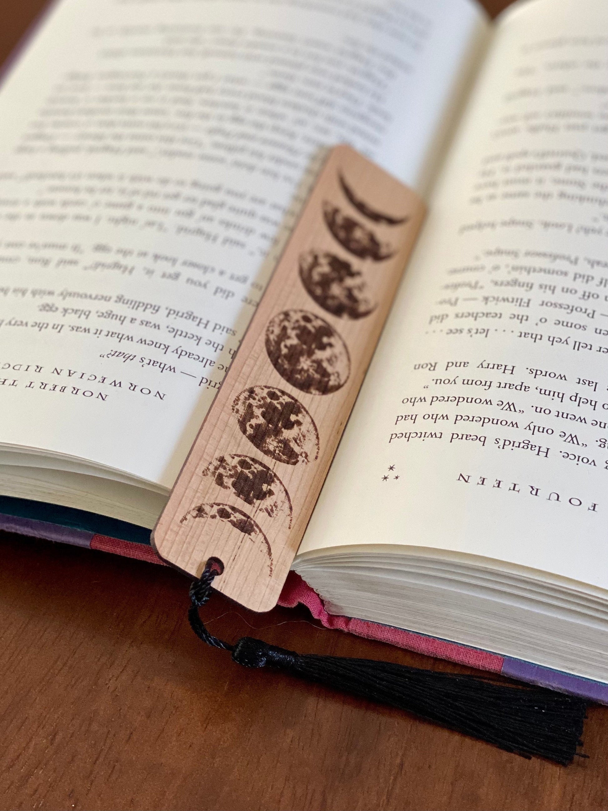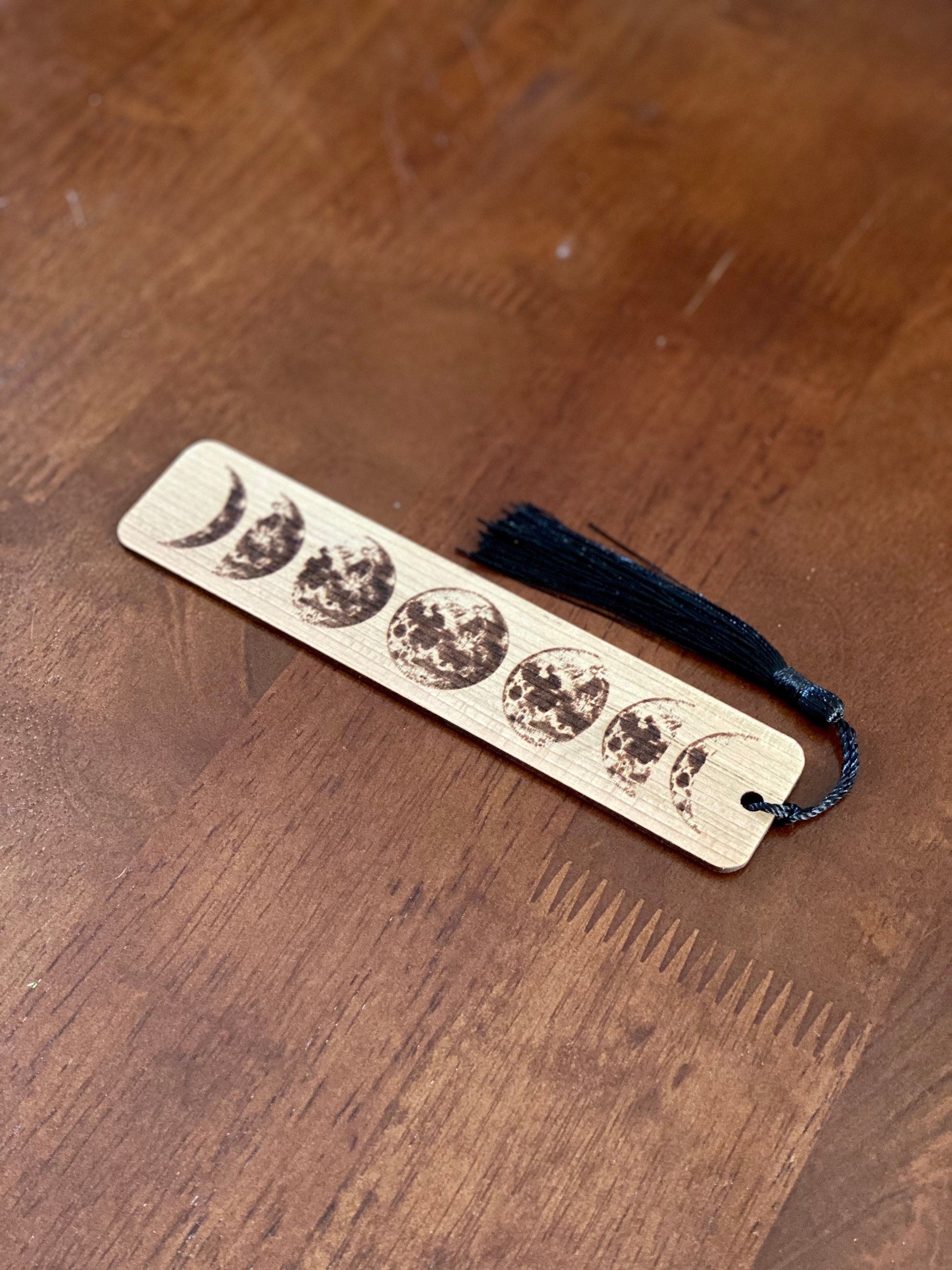 This engraved wood bookmark offers readers a stylish way of keeping track of where they left off. It features the phases of the moon laser engraved on the front.