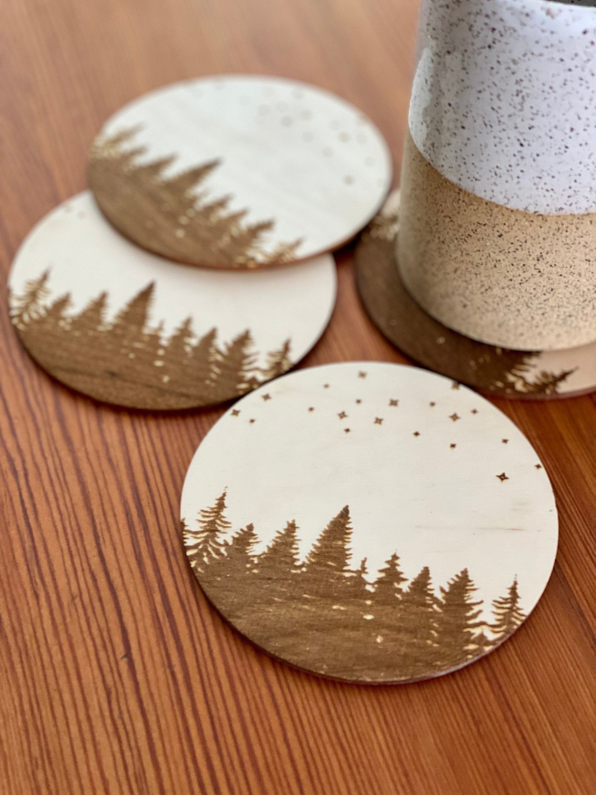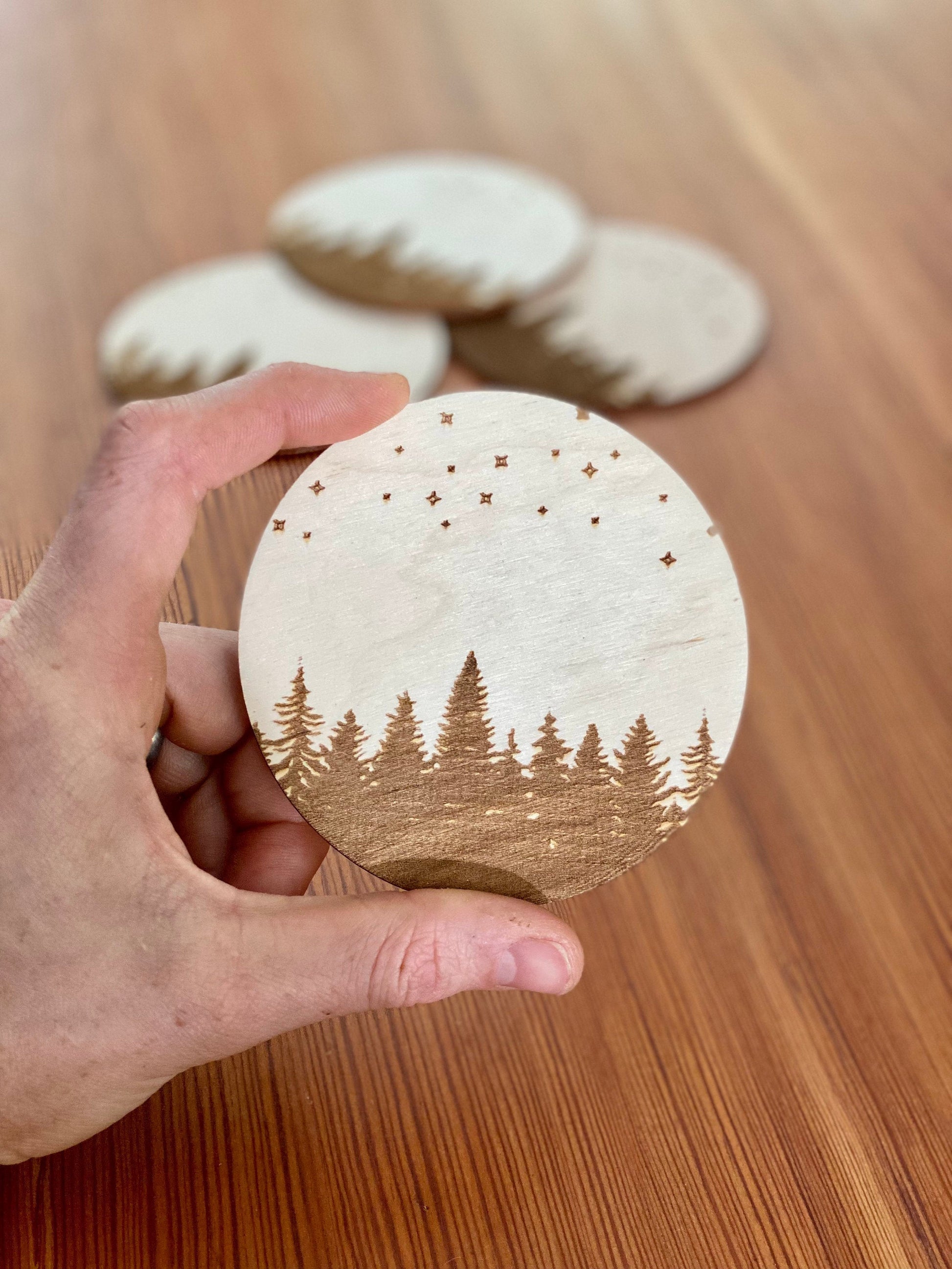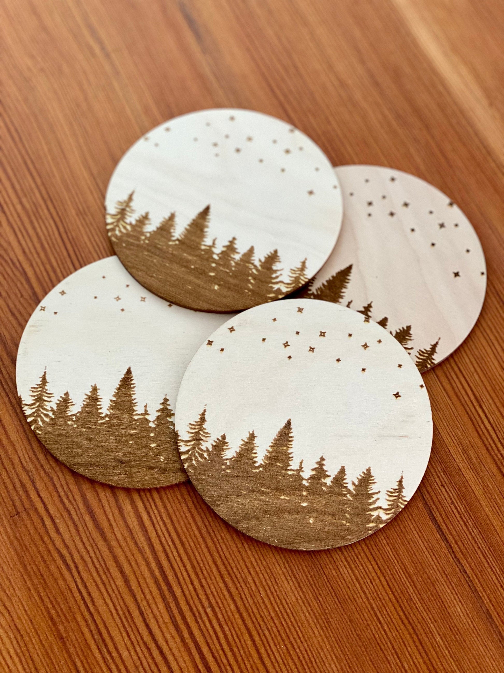 - Laser engraved pine trees and stars on each coaster